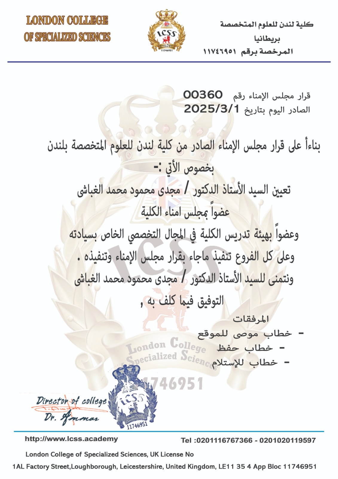أصدرت كلية لندن للعلوم المتخصصة بالمملكة المتحدة قرارًا رسميًا بتاريخ 1 مارس 2025، يحمل الرقم 00360، يقضي بتعيين الأستاذ الدكتور/ مجدي محمود محمد الغباشي عضوًا في مجلس أمناء الكلية، وعضوًا بهيئة تدريس الكلية في المجال التخصصي الذي يتميز به.